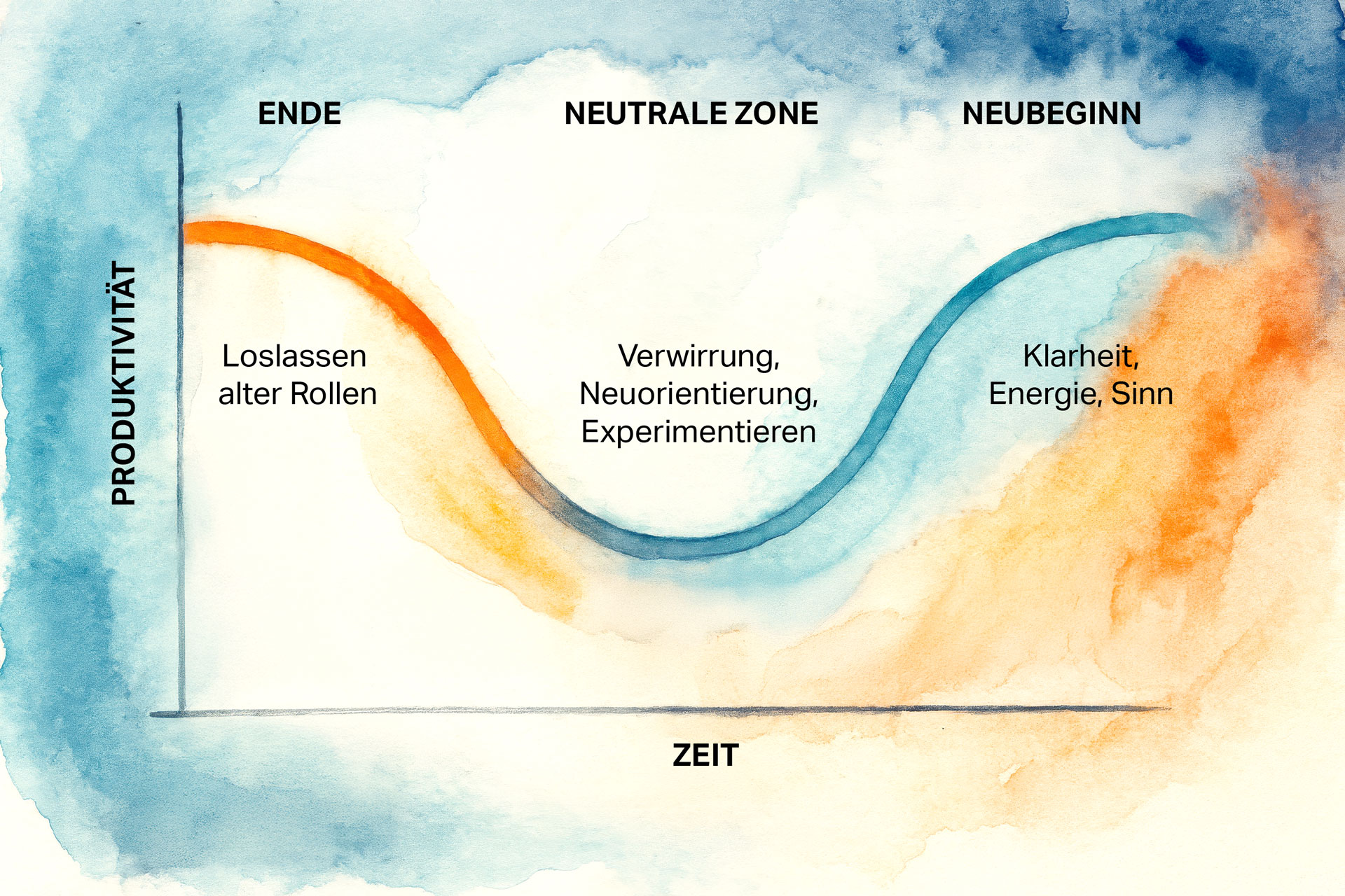 Oft begleitet von Unsicherheit, Widerstand oder Trauer. - Neutrale Zone: die Zwischenzeit, in der Altes nicht mehr gilt, Neues aber noch nicht trägt.